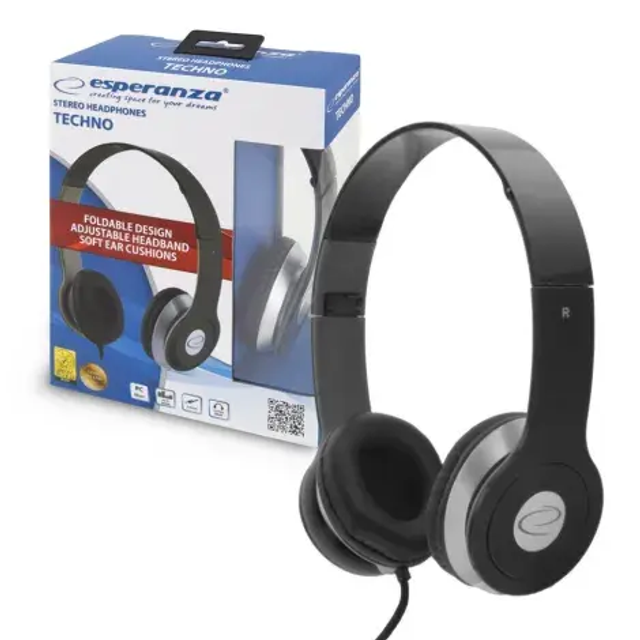 ESPERANZA Esperanza EH145K TECHNO - Écouteurs - circum-aural - filaire - jack 3,5mm - noir Casque stéréo de haute qualité avec réglage du volume. Bandeau élastique facile à régler. Les coussinets souples sont recouverts d'un matériau en létherette anti-bruit. Compatible avec toutes les cartes son et tous les appareils audio courants.